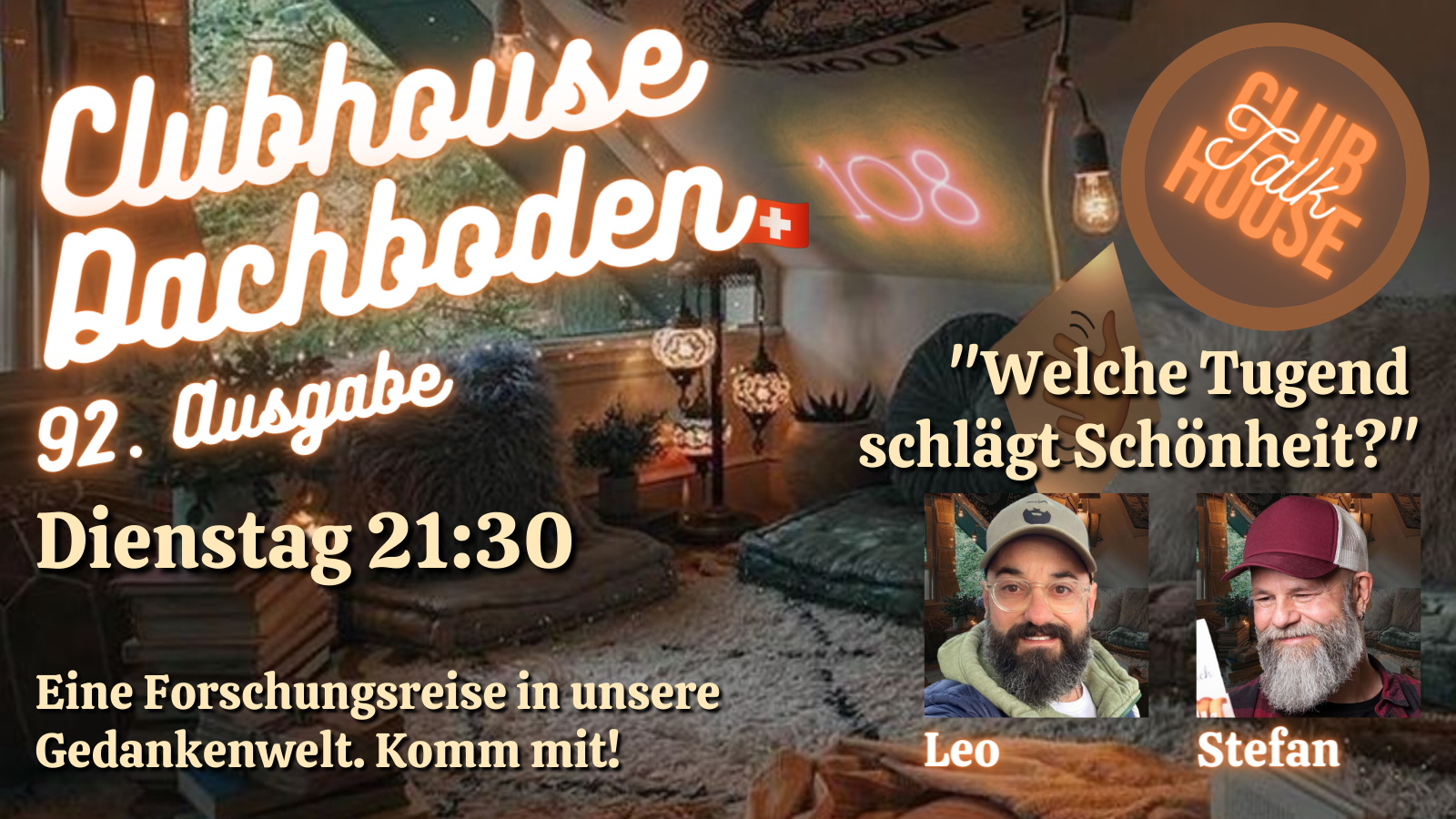 Der Dachboden ist ein virtueller Raum in der Clubhouse Audio App. Unseres Wissens der einzige Raum auf Clubhouse, in dem im zweiwöchentlichen Rhythmus Schweizerdeutsch gesprochen wird. Wir wechseln zwischen Schweizerdeutsch und Hochdeutsch ab, damit sich auch unsere Deutschen und Österreichischen Gäste am Gespräch beteiligen können. Natürlich darf auch in den Schweizerdeutschen Räumen hochdeutsch gesprochen werden, die Moderation wird dann allerdings trotzdem in Schweizerdeutsch sein.
