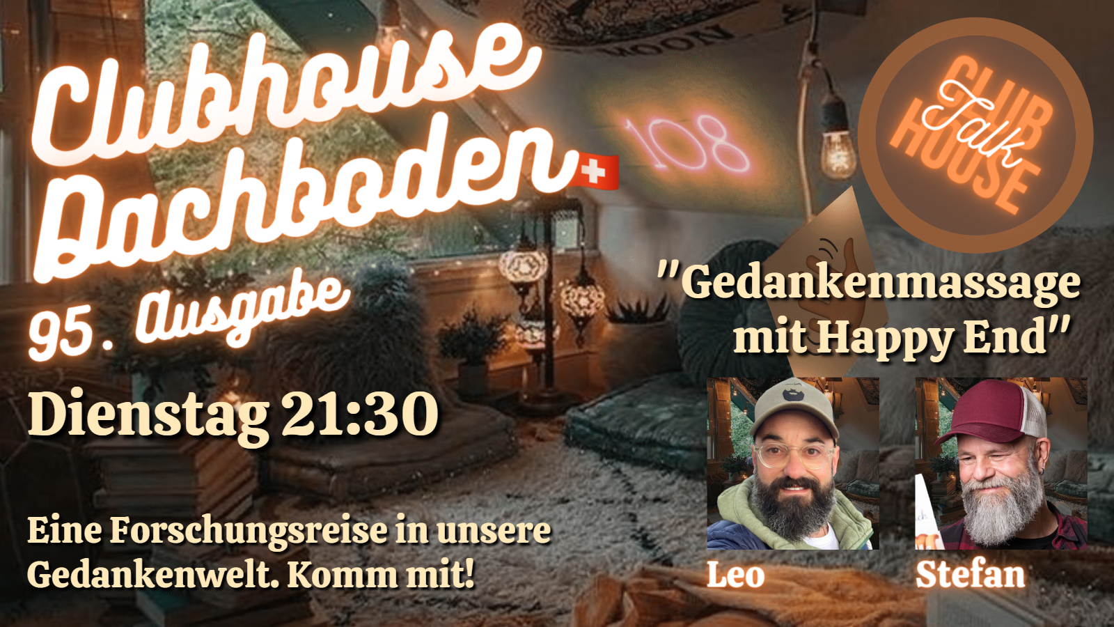 Der Dachboden ist ein virtueller Raum in der Clubhouse Audio App. Unseres Wissens der einzige Raum auf Clubhouse, in dem im zweiwöchentlichen Rhythmus Schweizerdeutsch gesprochen wird. Wir wechseln zwischen Schweizerdeutsch und Hochdeutsch ab, damit sich auch unsere Deutschen und Österreichischen Gäste am Gespräch beteiligen können. Natürlich darf auch in den Schweizerdeutschen Räumen hochdeutsch gesprochen werden, die Moderation wird dann allerdings trotzdem in Schweizerdeutsch sein.