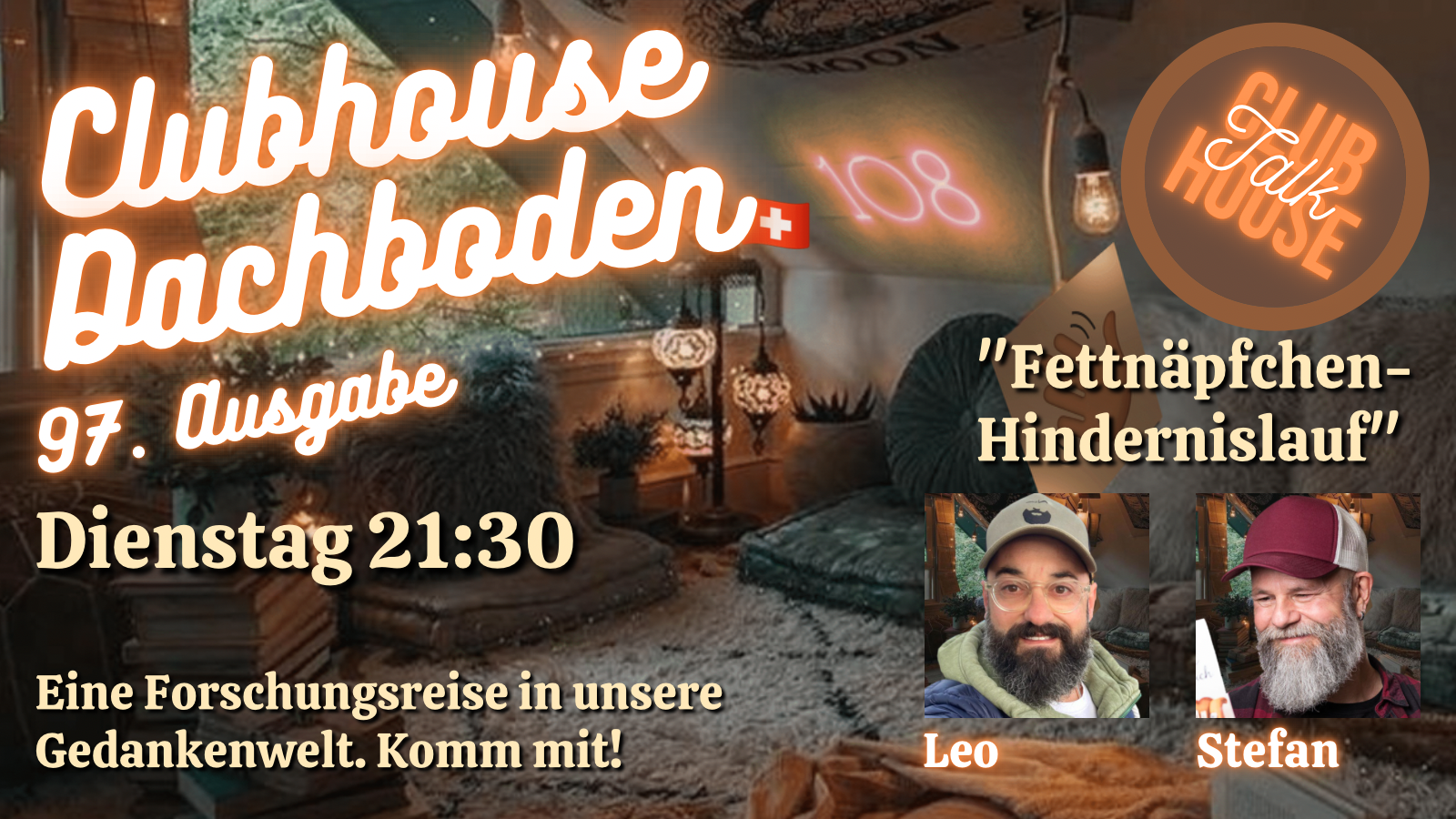 Der Dachboden ist ein virtueller Raum in der Clubhouse Audio App. Unseres Wissens der einzige Raum auf Clubhouse, in dem im zweiwöchentlichen Rhythmus Schweizerdeutsch gesprochen wird. Wir wechseln zwischen Schweizerdeutsch und Hochdeutsch ab, damit sich auch unsere Deutschen und Österreichischen Gäste am Gespräch beteiligen können. Natürlich darf auch in den Schweizerdeutschen Räumen hochdeutsch gesprochen werden, die Moderation wird dann allerdings trotzdem in Schweizerdeutsch sein.
