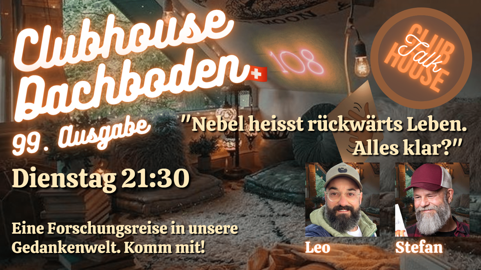 Der Dachboden ist ein virtueller Raum in der Clubhouse Audio App. Unseres Wissens der einzige Raum auf Clubhouse, in dem im zweiwöchentlichen Rhythmus Schweizerdeutsch gesprochen wird. Wir wechseln zwischen Schweizerdeutsch und Hochdeutsch ab, damit sich auch unsere Deutschen und Österreichischen Gäste am Gespräch beteiligen können. Natürlich darf auch in den Schweizerdeutschen Räumen hochdeutsch gesprochen werden, die Moderation wird dann allerdings trotzdem in Schweizerdeutsch sein.