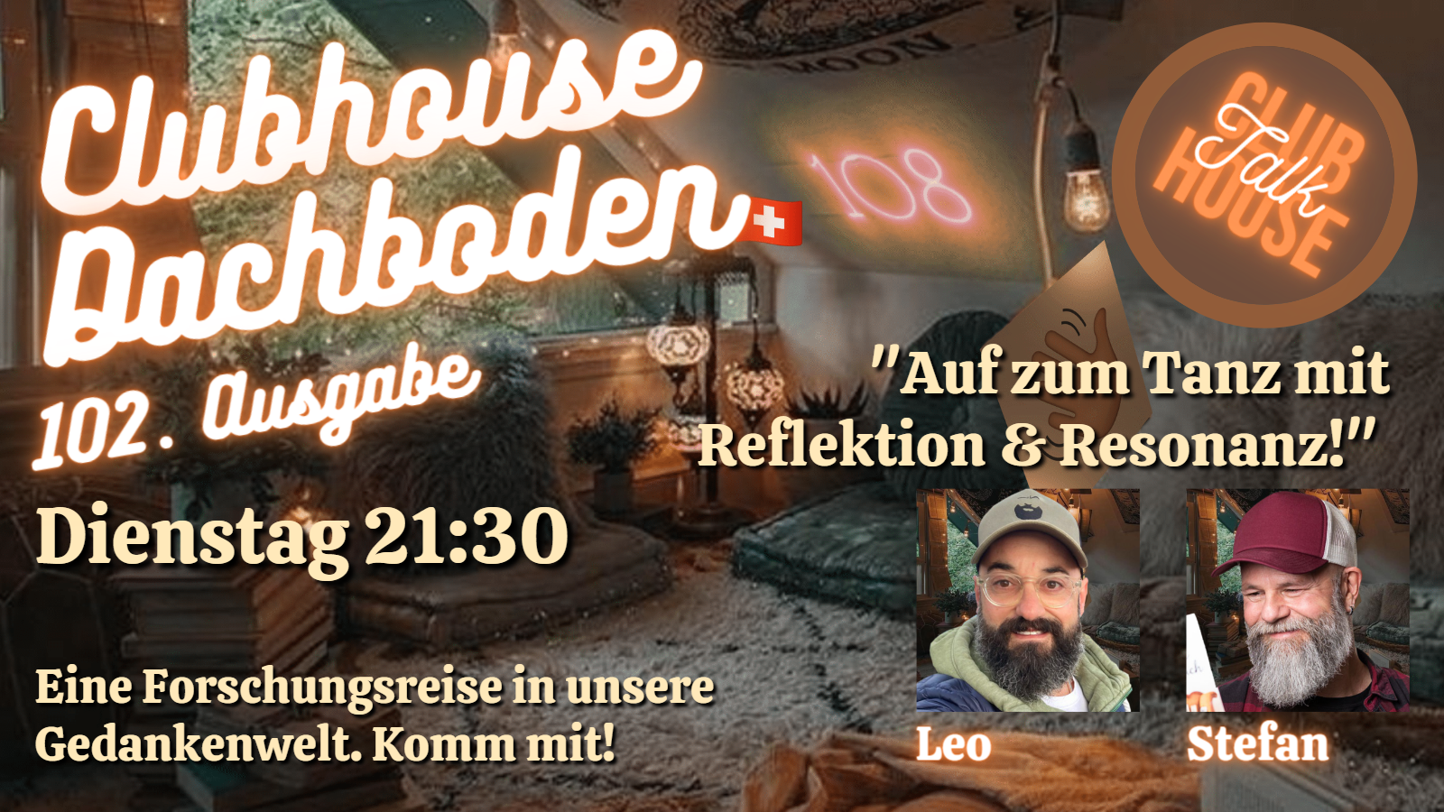 Der Dachboden ist ein virtueller Raum in der Clubhouse Audio App. Unseres Wissens der einzige Raum auf Clubhouse, in dem im zweiwöchentlichen Rhythmus Schweizerdeutsch gesprochen wird. Wir wechseln zwischen Schweizerdeutsch und Hochdeutsch ab, damit sich auch unsere Gäste aus Deutschland, Österreich und anderen Ländern am Gespräch beteiligen können. Natürlich darf auch in den Schweizerdeutschen Räumen hochdeutsch gesprochen werden, die Moderation wird dann allerdings trotzdem in Schweizerdeutsch sein.