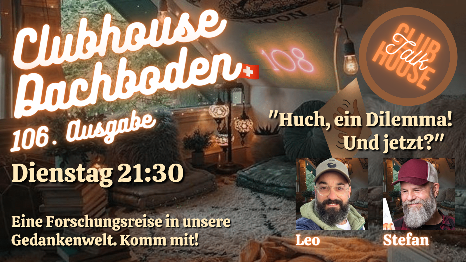 Der Dachboden ist ein virtueller Raum in der Clubhouse Audio App. Unseres Wissens der einzige Raum auf Clubhouse, in dem im zweiwöchentlichen Rhythmus Schweizerdeutsch gesprochen wird. Wir wechseln zwischen Schweizerdeutsch und Hochdeutsch ab, damit sich auch unsere Mitsprechenden und Zuhörenden aus Deutschland, Österreich und anderen Ländern am Gespräch beteiligen können. Natürlich darf auch in den Schweizerdeutschen Räumen hochdeutsch gesprochen werden, die Moderation wird dann allerdings trotzdem in Schweizerdeutsch sein.