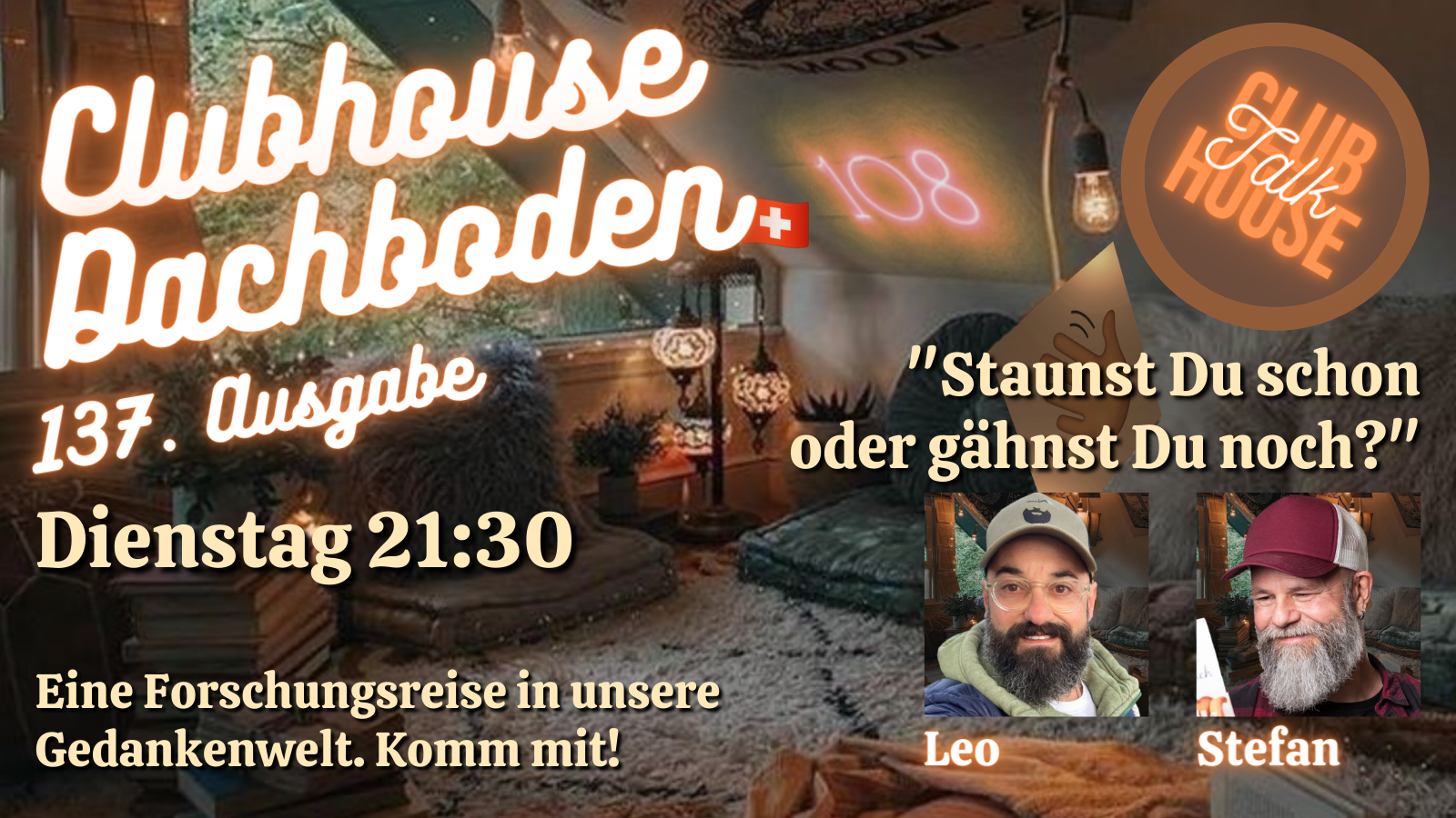 Am Dienstag 09. April 2024 um 21:30 ist es wieder soweit. Wir öffnen den „Dachboden“ auf Clubhouse, wie normalerweise jeden Dienstag um diese Uhrzeit.